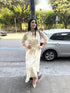 Abito chemisier in pizzo macrame con colletto alla coreana, manica a tre quarti, chiusura con bottoni frontali e cinturino in vita.