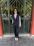 Coord set composto da gilet gessato doppiopetto con tasche frontali e pantalone dritto con elastico sul retro.